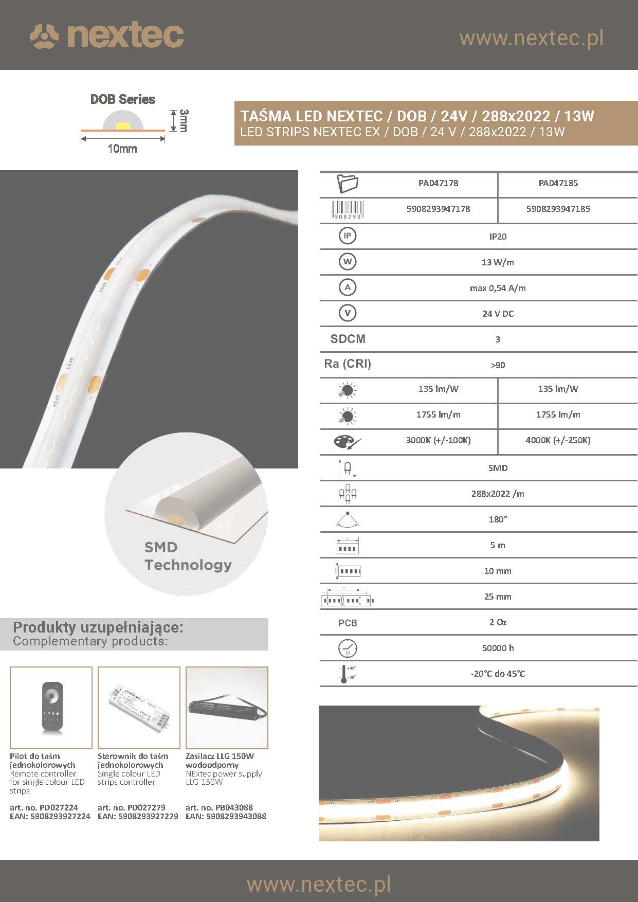 LED-riba NEXTEC PA047178 24V DOB 3000K on kõrgekvaliteediline LED-valgusti tihedusega 288 LED/m ja sooja, loomuliku 3000K valgusega. Tänu DOB 2022 tehnoloogiale pakub riba stabiilset ja ühtlast valgust ilma vilkumiseta, kõrget värviedastust (CRI >90) ning tõhusust 135 lm/W. Ideaalne dekoratiivseks interjöörivalgustuseks, mööbli, niššide ja äripindade valgustamiseks. Lihtne paigaldada isekleepuva aluse abil ning IP20 kaitseklass tagab töökindluse.