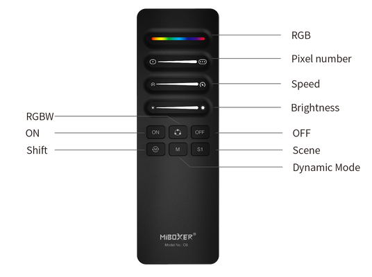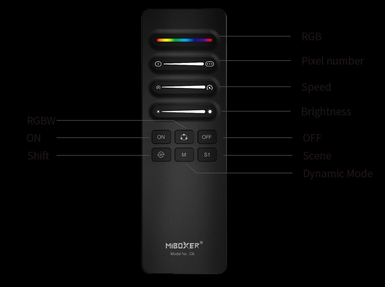 MiBoxer C6 on kaasaegne juhtmevaba pult aadresseeritavate (SPI) LED-ribade jaoks, mis võimaldab täielikku kontrolli dünaamilise valgustuse üle: värv, efektid, kiirus, heledus ja stsenaariumid.