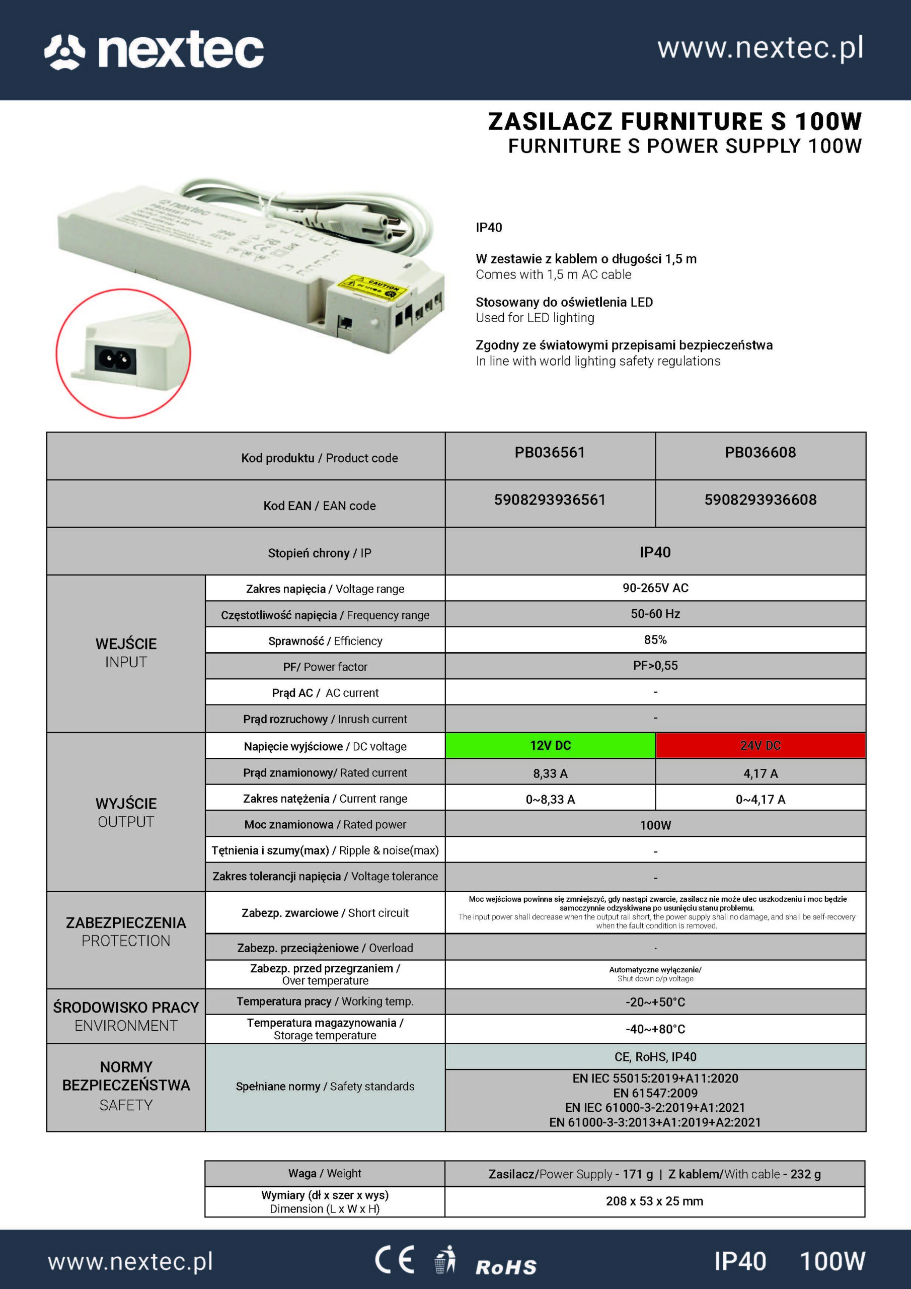 Toiteplokk NEXTEC Furnitures 100W toiteplokk 4.17A 24V IP40 PB036608
